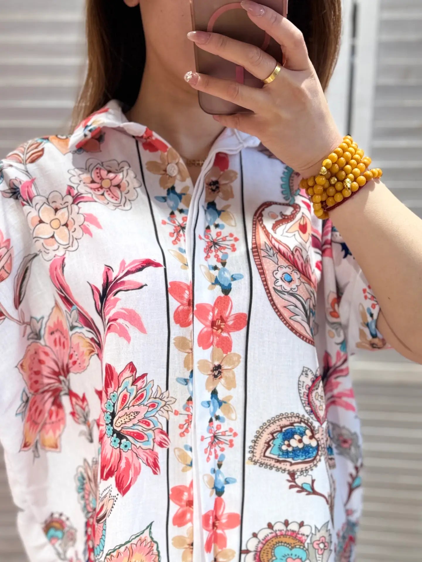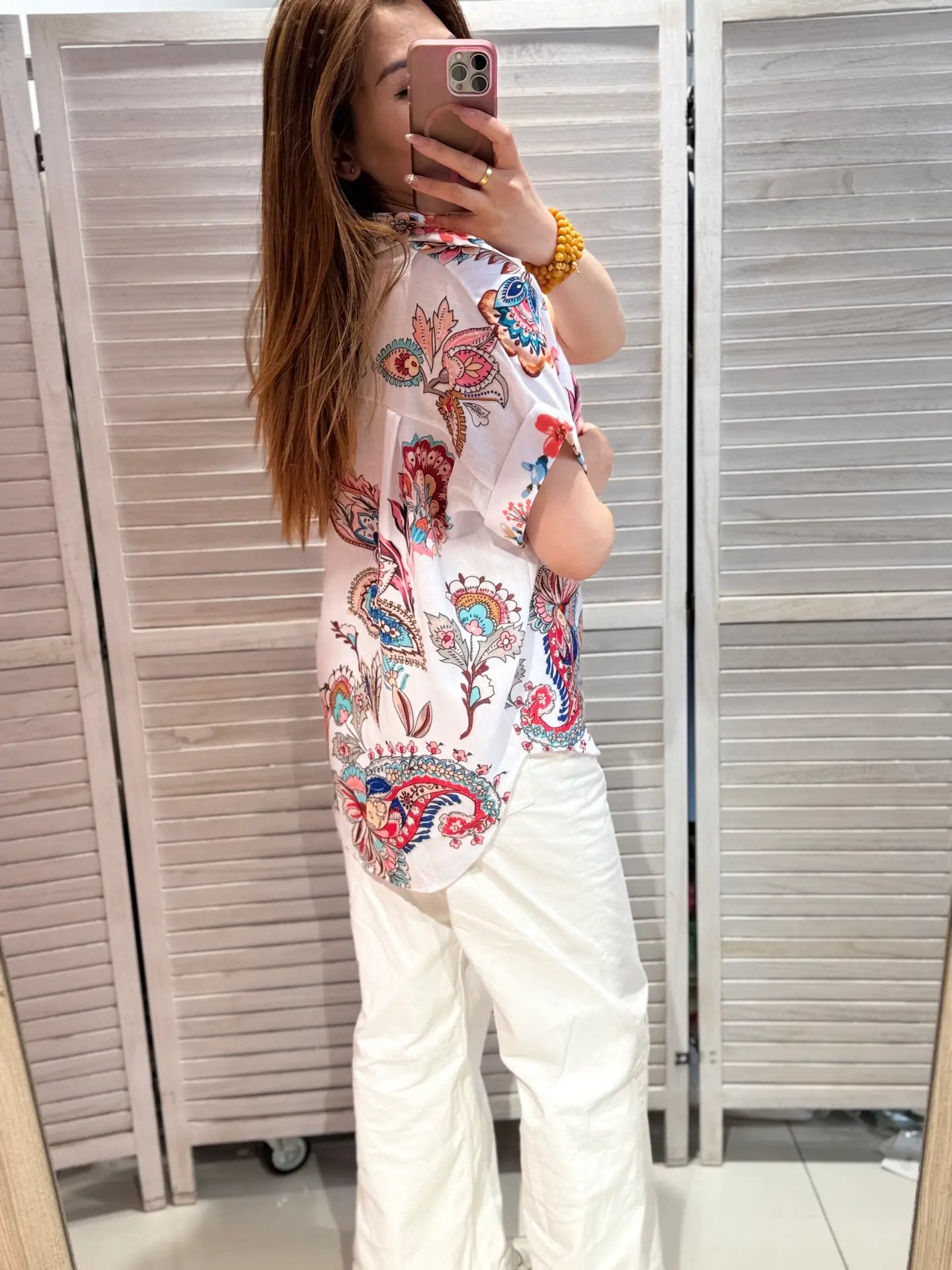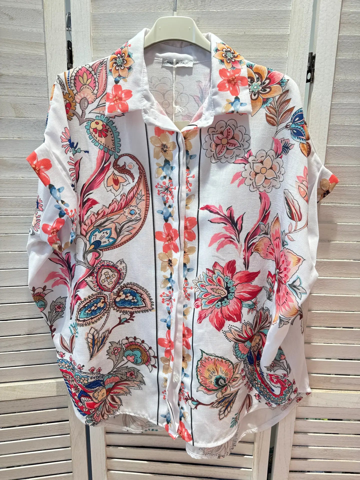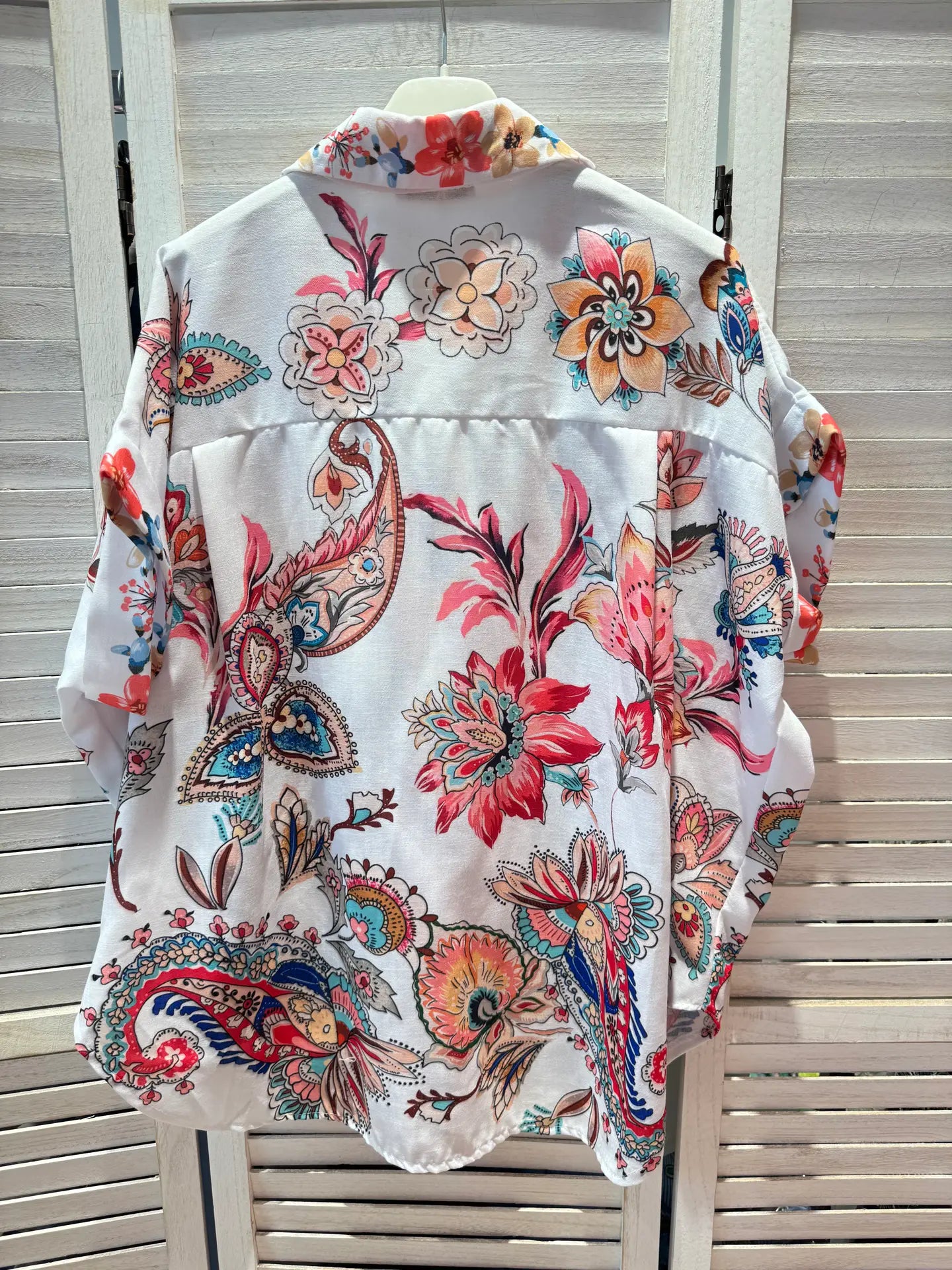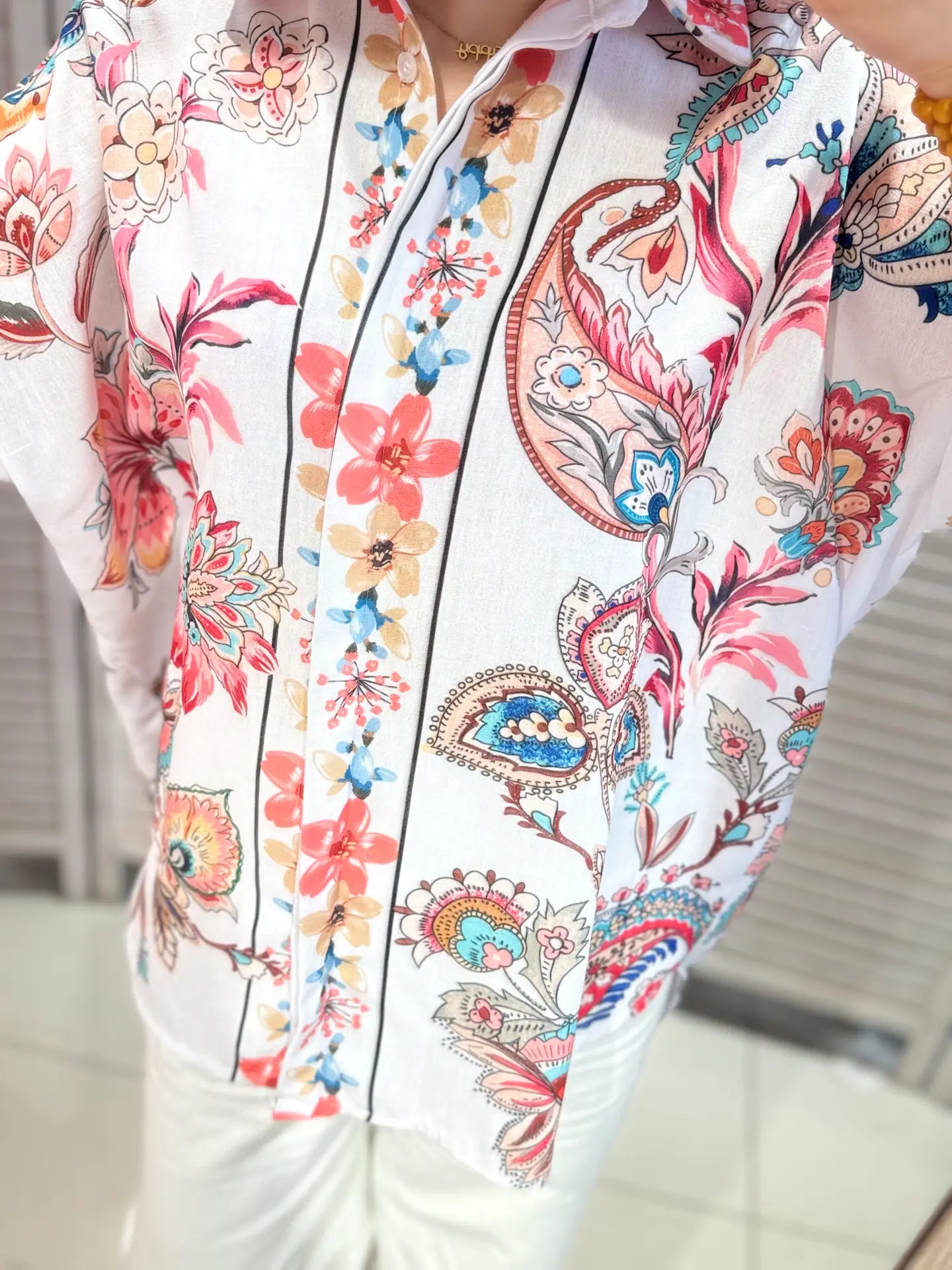 Light short-sleeved shirt, classic collar. Detailed floral print all over. Button closure at the front, offering a casual and elegant look, ideal for a fresh style in any season.