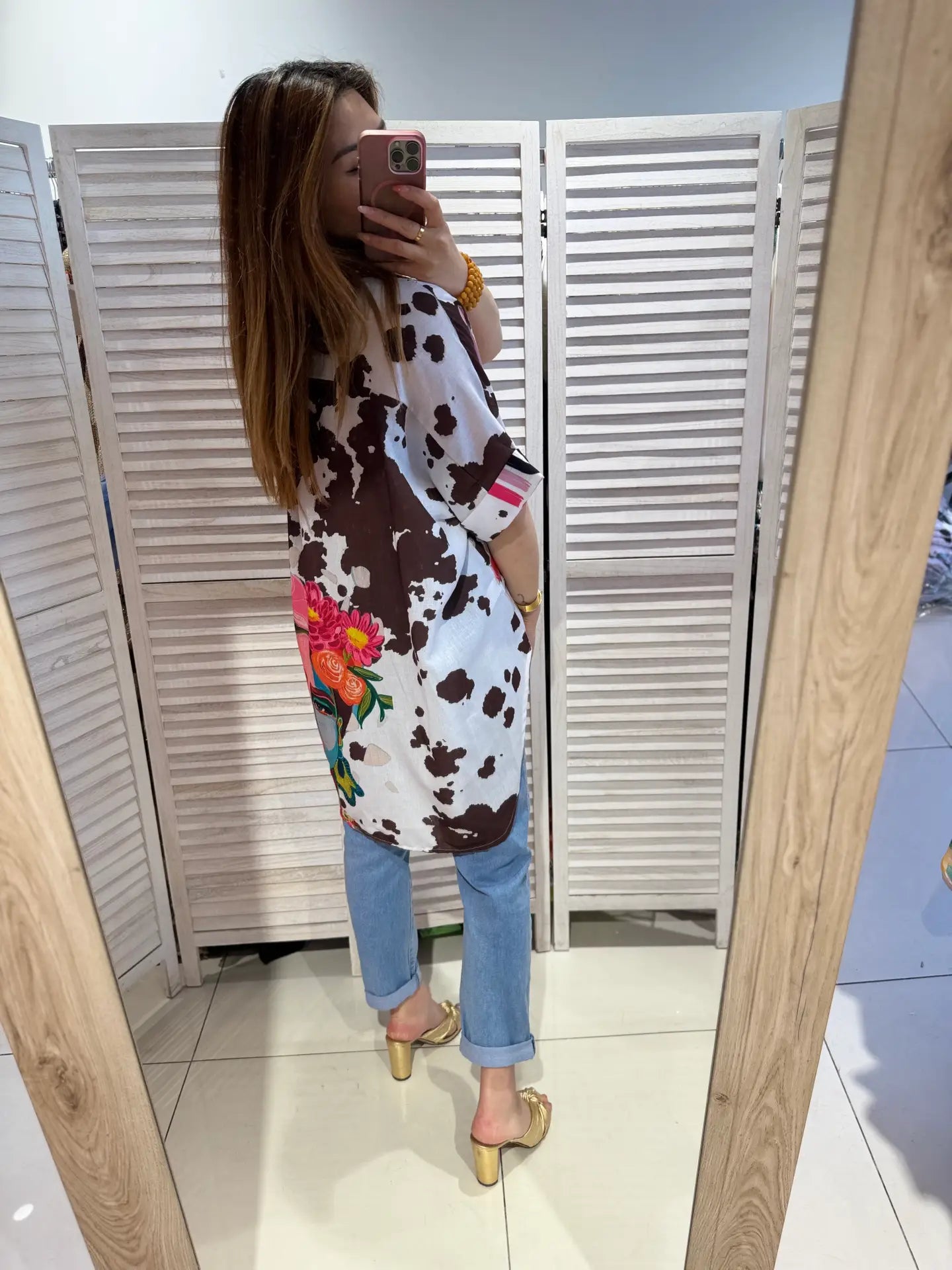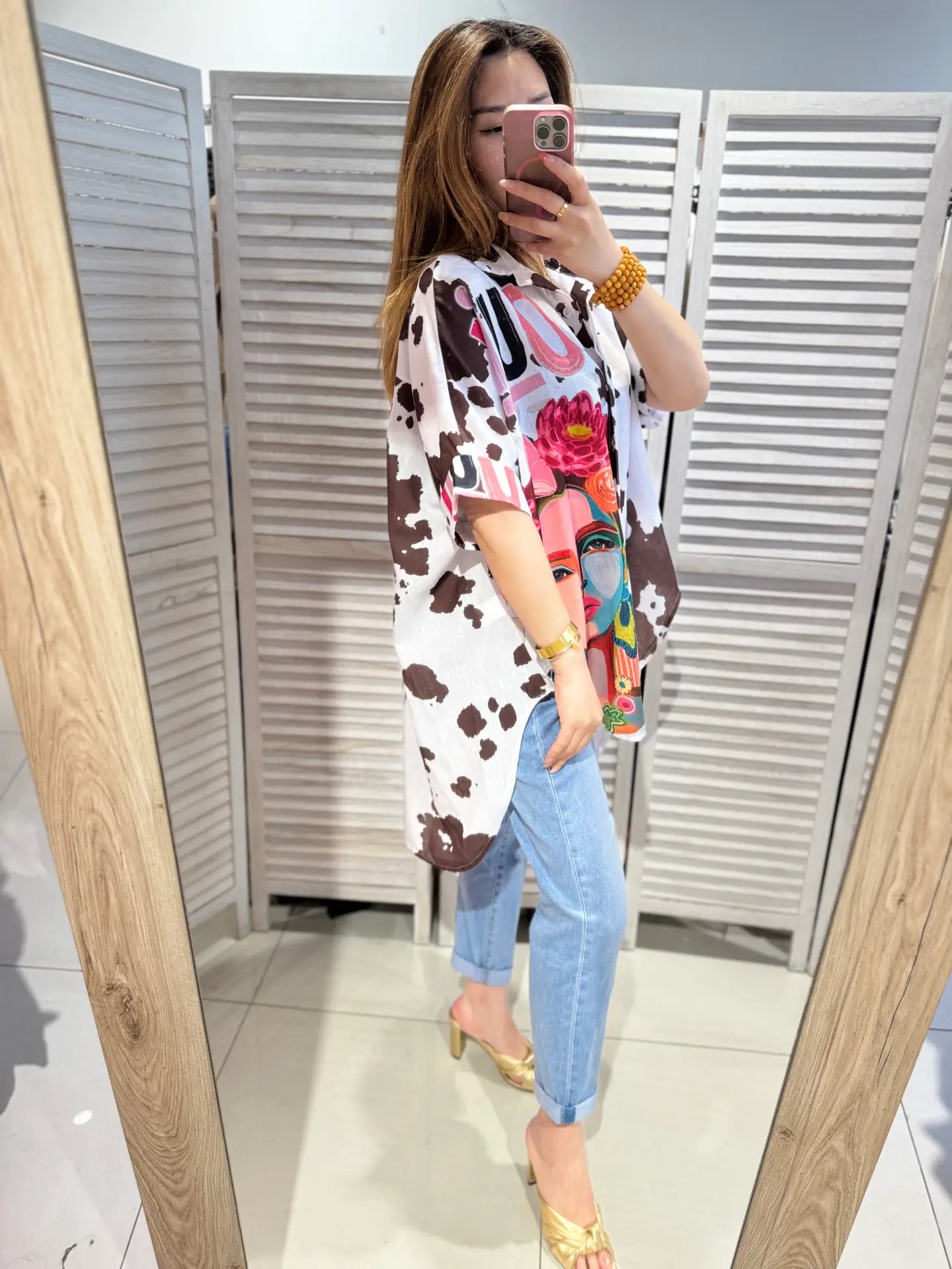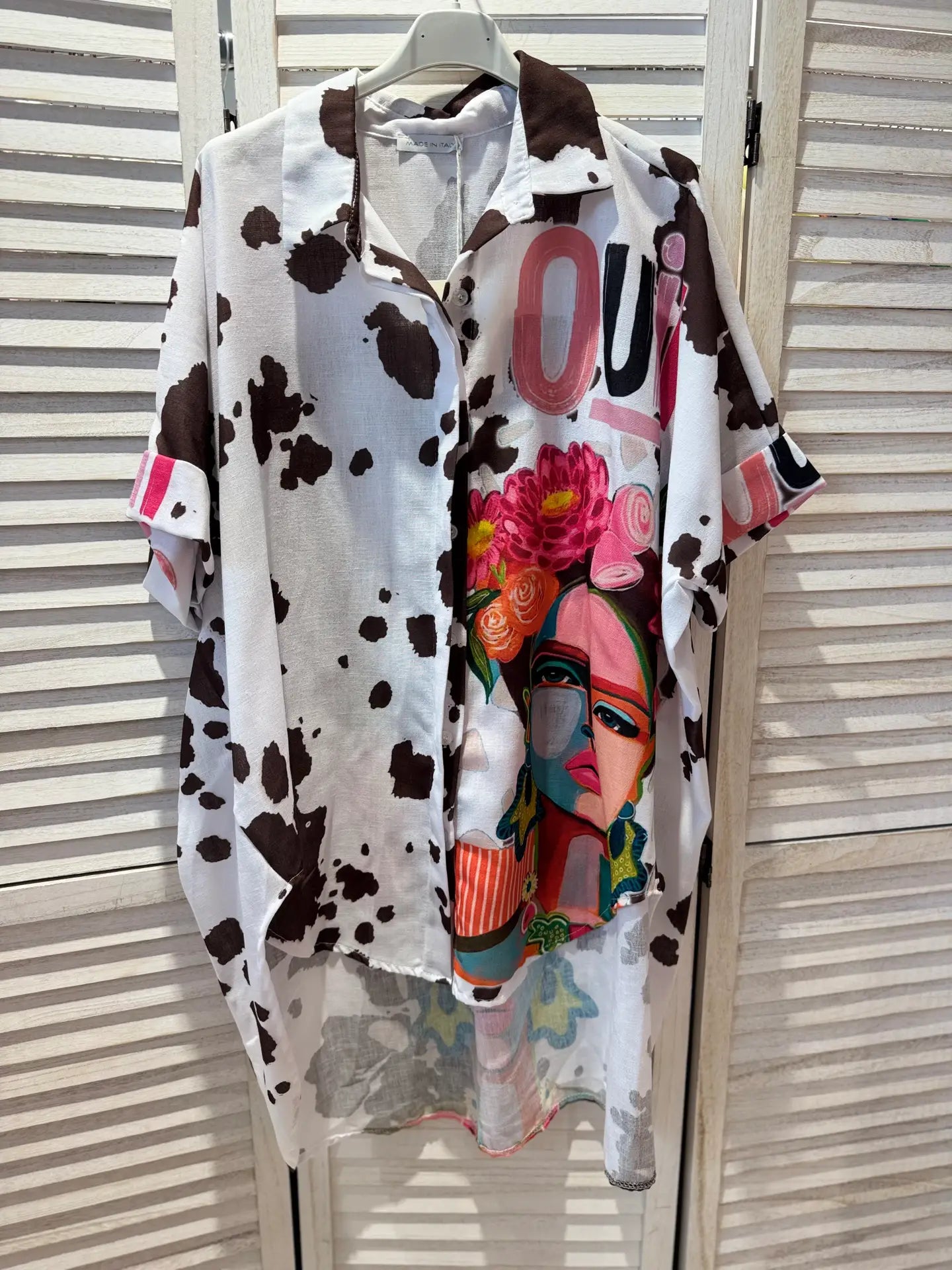 Oversized short-sleeve shirt, classic collar, with a unique artistic print. Fluid details and elongated cut for a casual look. Perfect for a contemporary style, to wear with jeans or shorts. Victoria&Isaac